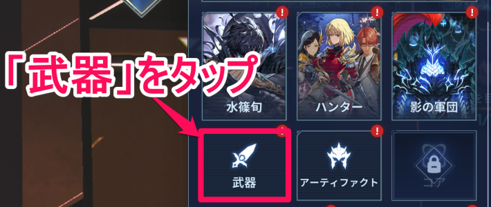 まずはメニューを開き、「武器」をタップして武器画面を開こう。