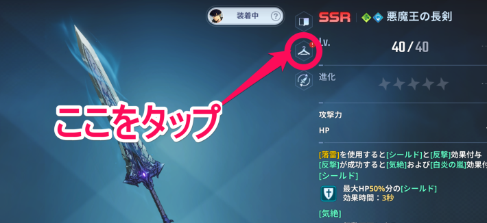 対象の武器を選択したら、画面中央右側にある「ハンガーのボタン(※画像赤丸)」をタップ。