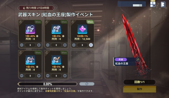 悪魔王の長剣の武器スキン『紅血の王座』は、武器スキン「紅血の王座」製作イベントで入手可能。期間内にイベントアイテムか魔法石を消費して製作ポイントを最大にする必要がある。