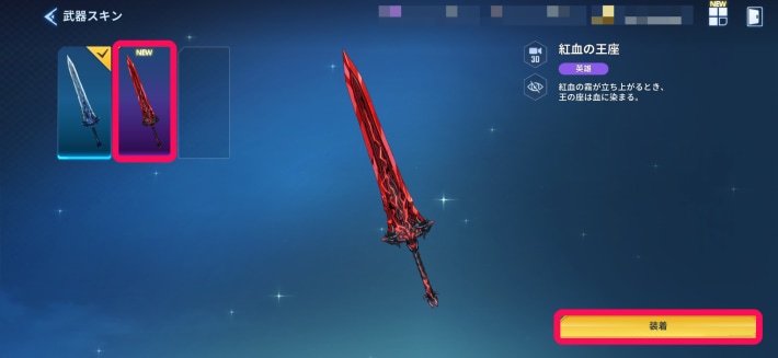 武器スキンの画面が開いたら、入手した武器スキンを選択。最後に「装着」をタップすればスキン変更完了となる。