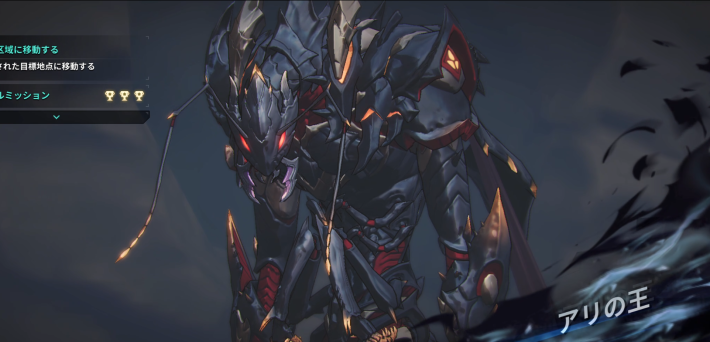 アリの王がステージ中央に移動し、高く飛び上がった後に複数の隕石を落としてくる。隕石落下&爆発後、アリの王が着地し範囲攻撃を行う。範囲攻撃の後、水篠に向かって単発の近接攻撃を行うので、最後の近接攻撃に極限回避を決めるのがおすすめ。
