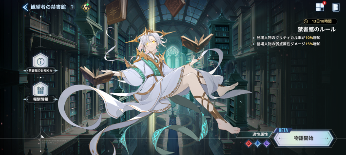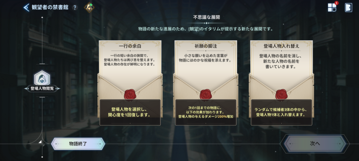 観望者の禁書館は、最終ステージをクリアした次点で終了となる。物語集計タップで最終集計画面が表示可能になり、集計画面で報酬が貰える。