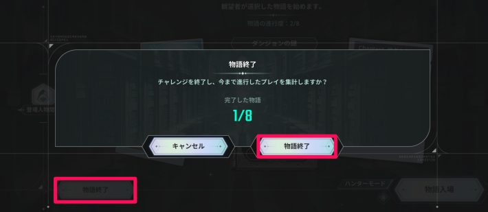 攻略画面左下にある「物語終了」をタップした後に表示される確認画面で物語終了をタップすると、攻略を中断して中間集計が行われる。最後まで攻略が厳しい場合に中断を利用するのがおすすめだ。