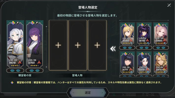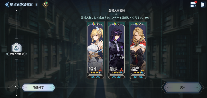 ハンター選択後、登場人物選定画面に遷移する。ここでは、最初の物語(ステージ)に登場させるハンターを3人選択することができる。決まったら「選定」をタップして、攻略を開始しよう。