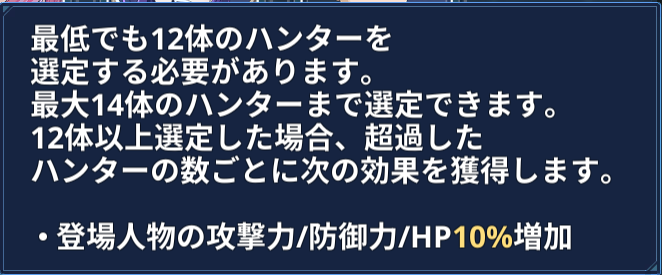 難易度ごとに設定されている最低入場可能数より多くハンターを編成すると、最低入場可能数を超過したハンターの数ごとに追加効果を獲得する。追加効果獲得のため、最低入場可能数を超えるようにしよう。