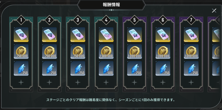 観望者の禁書館では、最後の物語クリアや進行中の物語の中断(中間集計)で、ステージクリア数に応じて報酬が貰える。貰える報酬はシーズン1回のみ獲得可能で、何度も繰り返し貰うことはできない。