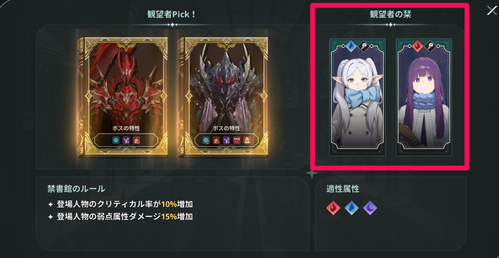 観望者の禁書館で出現する敵は、観望者Pickの対象になっている敵を除きランダムで決まる。ブレイクゲージ持ちなど様々な敵に対応するためにも、攻略メンバーやPTにブレイカー/アタッカー/サポーターをバランス良く編成しておこう。