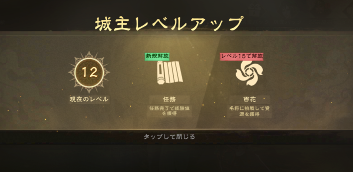 城主レベルが12になると「任務」が解放されます。任務では、毎日指定の任務をこなすことで元宝や城主経験値を入手できます。序盤は任務の解放を目指し、日課を解放できるようにしましょう。