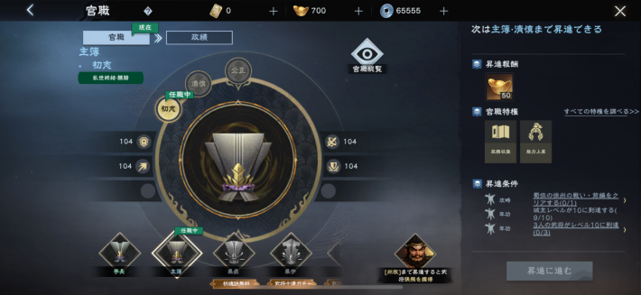 序盤は官職を昇進させて報酬を獲得することも重要です。報酬では元宝(ガチャ石)やガチャチケットを入手できるため、昇格条件を達成したら必ず昇格させましょう。昇格条件は画面右上の「官職」から確認できます。