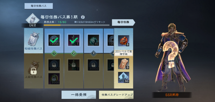 任務をクリアすることで、毎日任務パスのレベルも上がります。レベルを上げて育成素材や銀貨、戦魄などを入手しましょう。上級任務パスを購入すると追加のアイテムも獲得可能です。