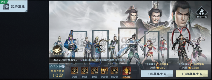 操作方法を覚えたあとは、武将募集を10連分引くことが可能です。最初はR星彩、次でR関平が確定になり、手持ちのキャラが3体に増えます。