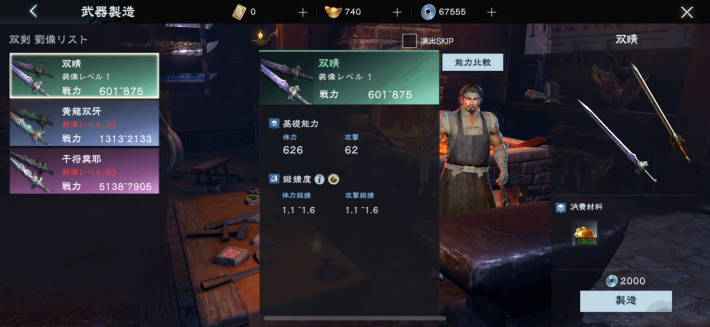 戦力を強化するためには武将ごとの武器を装備させましょう。武器はストーリーを進めると解放できる「鍛冶屋」で製造できます。