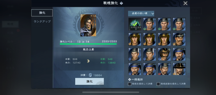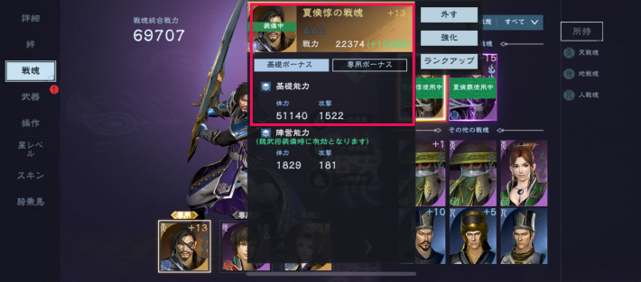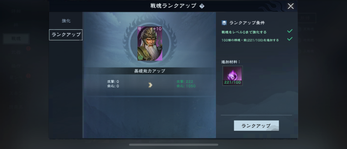 戦魄はレベルアップの他に「ランクアップ」が可能で、「精魄」や同名の戦魄を消費することでランクを上げられます。戦魄のランクを上げることでステータスやレベル上限をアップできます。