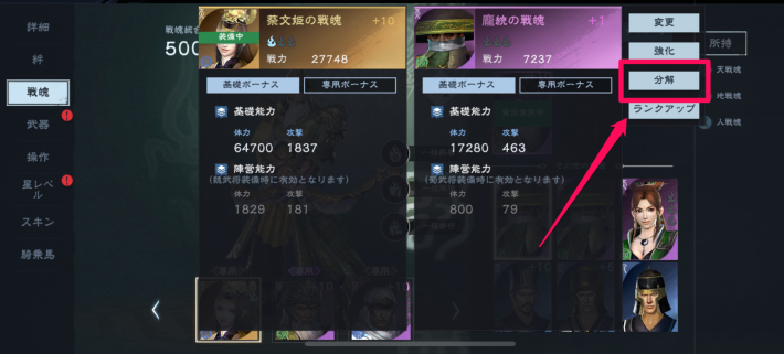 戦魄を分解することで精魂や戦魄経験、銀貨を入手できます。分解は戦魄選択画面の「分解」タブを押すと分解画面に移行します。