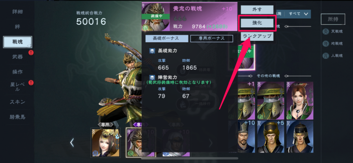 戦魄はキャラの戦魄選択画面から強化できます。強化したい戦魄を選択し「強化」を選択することで強化画面に移行します。