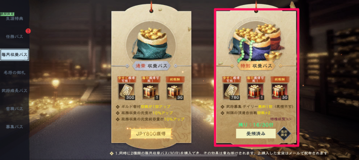 特別収益パスを購入することで、連合演武の挑戦回数が2回増加します。また、毎日元宝や課金ポイント、毎日1回無料で引ける武将募集などの特典があるため、課金を予定している場合は特別収益パスの購入がおすすめです。
