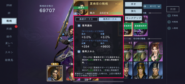 戦魄は各キャラごとに存在し、キャラと同じ戦魄を装備させることで「専用ボーナス」や「陣営能力」のボーナスが発生します。ボーナス効果でステータスを大幅に上昇できるため、できるだけキャラと同じ戦魄を装備させましょう。
