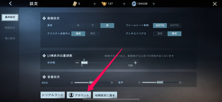 設定画面から「アカウント」を選択しましょう。タイトル画面右にある「アカウント」からも同じ画面に移動できます。