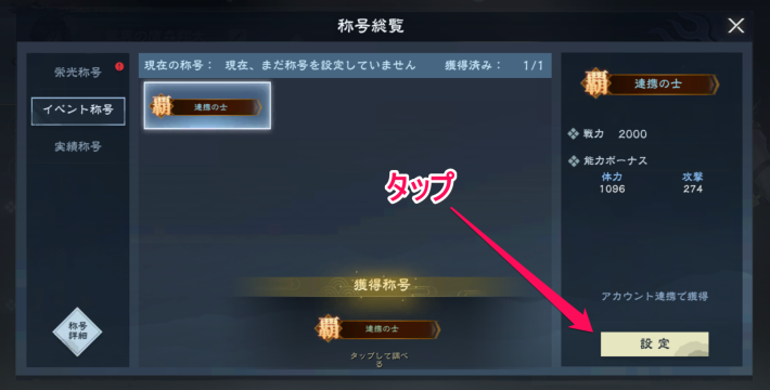 アカウントを連携すると「元宝×800」と「連携の士(称号)」を入手できます。報酬はゲーム内のメールから受け取り可能です。称号は解放することで武将の能力が上がるため、受け取ったらすぐ解放しましょう。