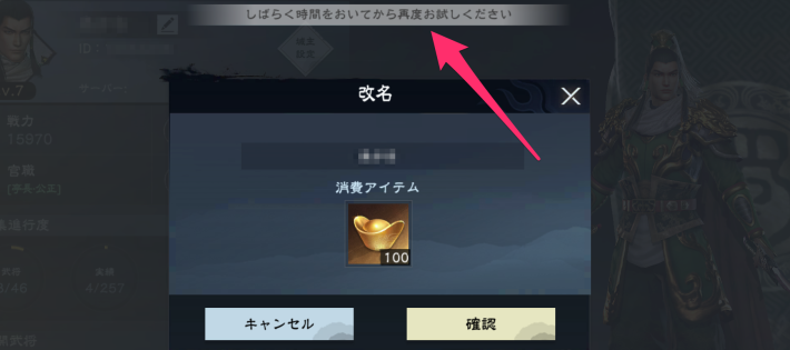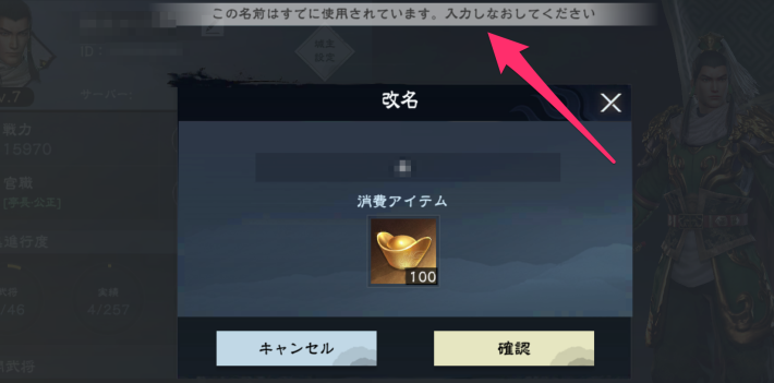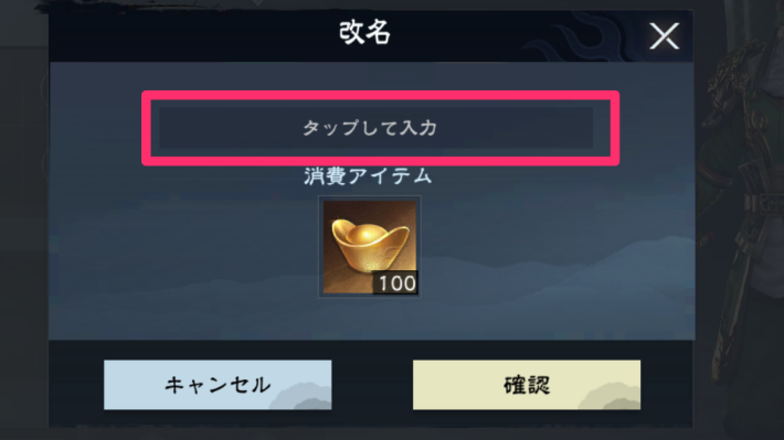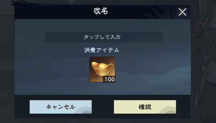 改名の画面で、新しい名前を入力しましょう。間違えが無ければ「確認」をタップすると元宝×100を消費し改名が完了します。