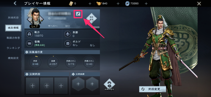 プレイヤー情報を開くと、現在の名前が表示されます。名前の右にあるアイコンをタップして改名の画面を開きましょう。
