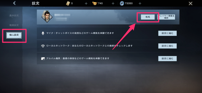 プレイヤー情報の画面以外でも、設定画面からの改名も可能です。右下の歯車アイコンから、個人設定を開くと改名ができます。