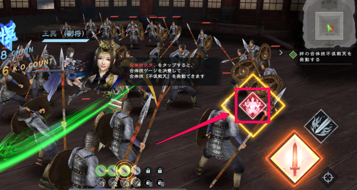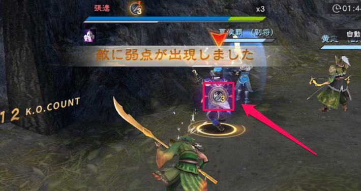 一部の敵将は弱点が出現し、指定されたチャージ攻撃を敵に当てることで弱点を攻撃できます。弱点を攻撃すると敵を気絶状態にしながら自身の与ダメージとアーマーが強化されるため、出現した場合は積極的に攻撃しましょう。