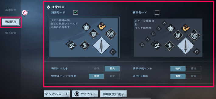 真・三國無双 覇の戦闘時の操作は、設定にある「戦闘設定」から変更可能です。ボタン配置のモードやカメラ速度、ロックオンの設定などを変更できます。