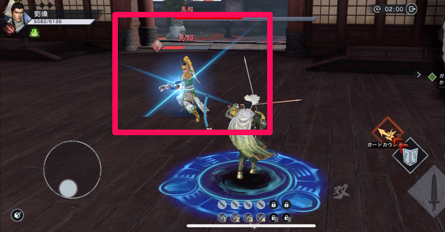 敵将が光を放つ攻撃をしたタイミングに、ガードボタンを長押しした状態でボタンを上にスワイプすると「ガードカウンター」を発動可能です。タイミングは少し難しいですが前方からの攻撃を防ぎながら敵にダメージを与えられます。