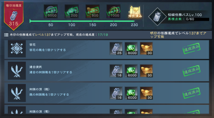 | 連合の知謀戦を1回クリアする | ・毎日貢献度×16 ・城主経験値×6000 ・元宝×30 |