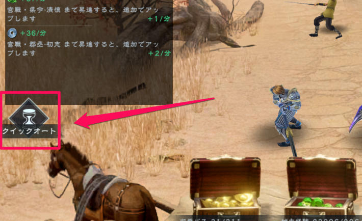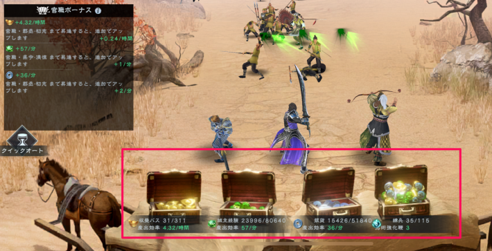政務にある「クイックオート」をタップすることで、36時間分の銀貨と4時間分の城主経験値を即座に入手できます。クイックオートには元宝を使用しますが1日1回無料で行えるため必ず受け取りましょう。