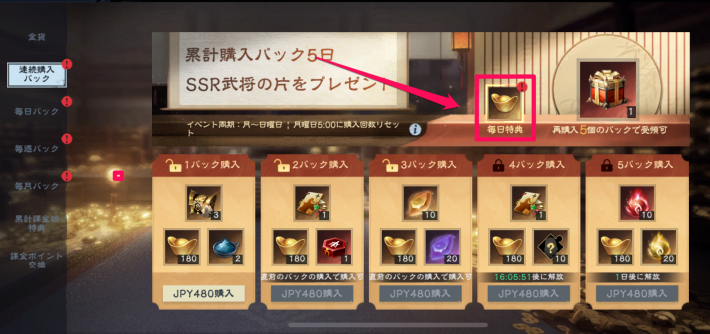 | 連続購入パック 毎日特典 | ・元宝×10 |