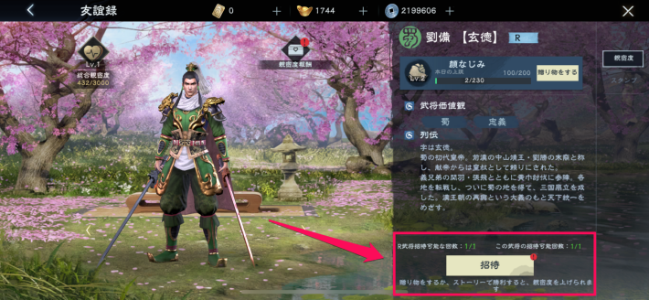 鑑賞室にある「友誼録」では、親密度のレベルが2以上の各レア度のキャラの中から毎日1回ずつ招待を送れます。招待を送ることで銀貨を入手可能です。
