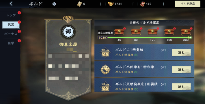 | ギルド寄付を1回行う | ・毎日貢献度×20 ・城主経験値×9000 ・元宝×30 |