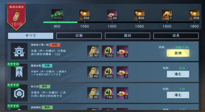 | 今週中に武の頂に累計2回挑戦する | ・毎週貢献度×30 ・祈魂訣×150 ・繁殖奇薬×1 |