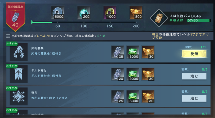 | 今週中に群英合戦に累計2回参加する | ・毎週貢献度×30 ・祈魂訣×150 ・繁殖奇薬×1 |