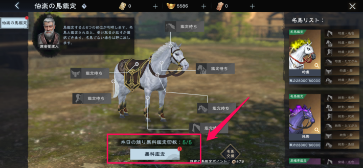 騎乗馬から確認できる「伯楽の馬鑑定」は毎日5回無料で馬を鑑定できるため、忘れずに鑑定しておきましょう。馬鑑定で名馬と鑑定された場合は、元宝を消費することで名馬を獲得できます。