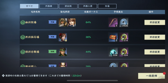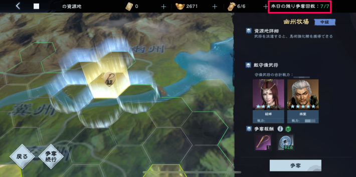 資源のタブにある「資源争奪」は、武将を派遣しその派遣が成功することでアイテムを回収できるコンテンツです。毎日5回まで争奪が可能なため資源地のアイテム回収と同時に確認しましょう。