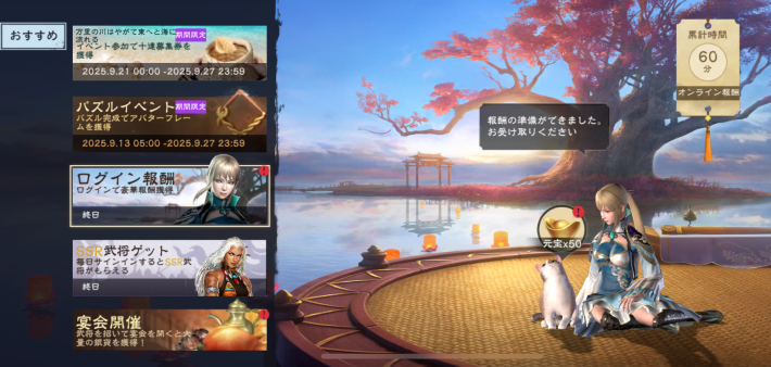 ボーナスから「ログイン報酬」を受け取ることで、銀貨などのアイテムを受け取れます。ログイン報酬はゲームをオンライン状態にしている時間に応じて報酬が増加し、最大60分の報酬として元宝がもらえます。