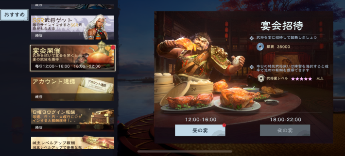 ボーナスの「宴会開催」では、所持しているキャラを選択して宴会に招待すると銀貨を入手できます。また、優勢武将のキャラを招待することで「宴会招待パック」を追加で獲得可能です。