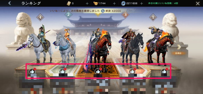 真・三國無双 覇では戦闘力や城主レベルなどに応じた「ランキング」を確認できます。戦闘力が高い上位5名にいいねを送ることで銀貨を入手可能です。いいねはランキング画面トップの手のマークを押すことで送信可能です。