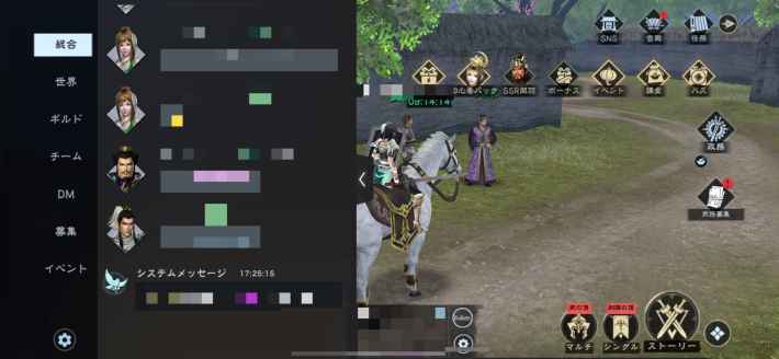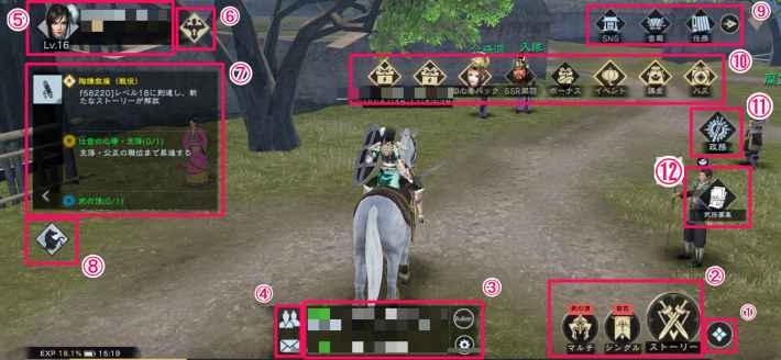 ストーリー・シングル・マルチのボタンをタップすると、各種戦闘コンテンツに移動できます。百花や武の頂(PvP)などの戦闘コンテンツに挑戦する場合、こちらから移動しましょう。