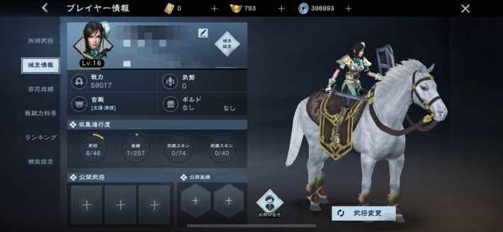 画面左上のアイコンをタップすると、自分の各種情報が確認できる画面に移動できます。自身のプロフィールの設定や、拠点などで操作する武将などの変更が可能です。