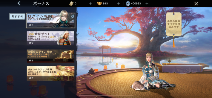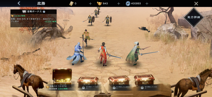 画面右側の政務アイコンから「政務」の画面に移動できます。時間経過で報酬が受け取れるので、定期的に確認しておきましょう。