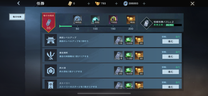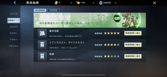 画面右上のアイコンからは、各種公式SNS・官職・任務の画面に移動が可能です。官職の昇進や任務の確認&報酬受取、公式SNSのフォローと報酬の受取などができます。
