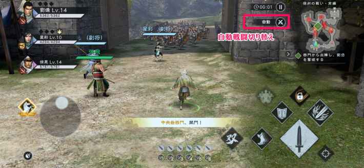 自動のアイコンをタップすると、近くの敵を自動で攻撃する「自動戦闘」への切り替えができます。自動戦闘中に手動に切り替えたい場合も、同じ場所をタップしましょう。