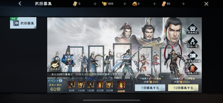 画面右側の武将募集アイコンから、「武将募集」の画面に移動できます。募集回数に応じたボーナスの受け取りが画面下部からできるので、忘れずに受け取っておきましょう。
