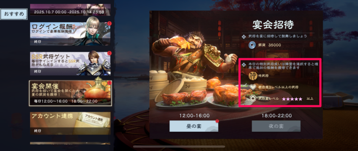キャラを特定の星レベルまで上昇させると、宴会招待の追加報酬条件の一部を満たせます。追加報酬として「宴会招待パック」を入手可能で、さまざまなアイテムを獲得できます。