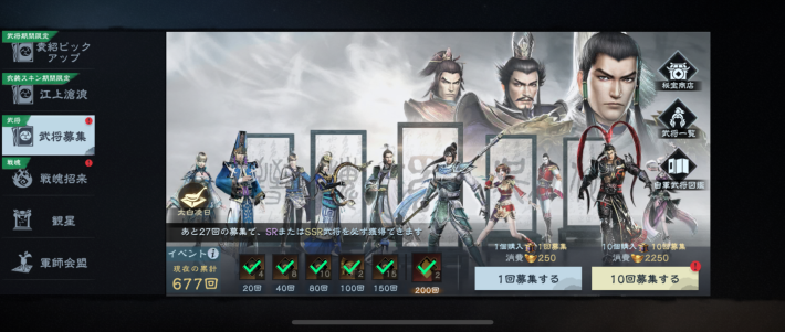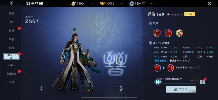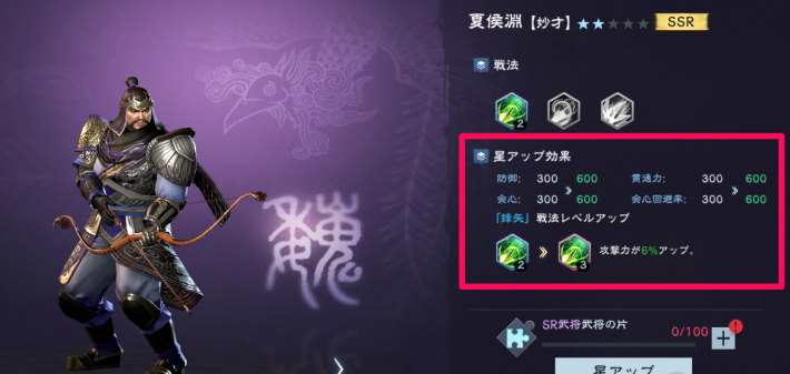 SSR武将は、星レベルを上げる際にR・SR・SSRすべてのレア度の欠片を多く求められます。星レベルを上げた時の恩恵は非常に大きいため、SSR武将を優先して星レベルを上げていくのがおすすめです。