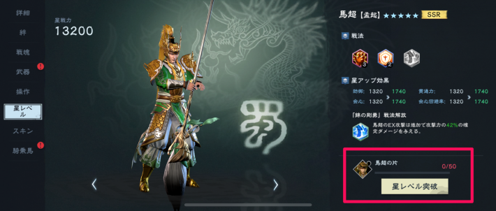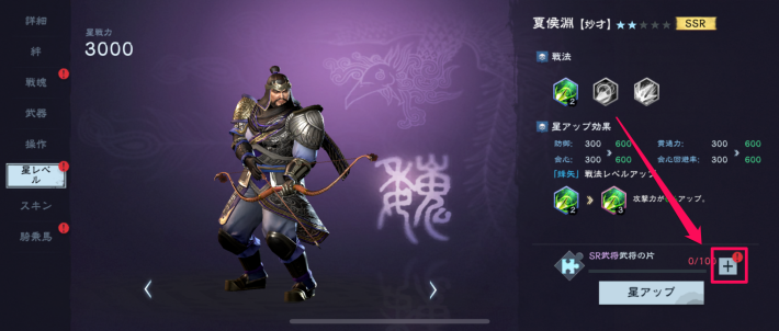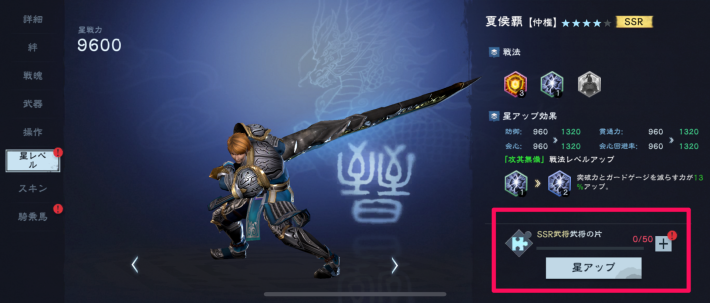 星のレベルアップに必要な片は星のレベルごとにレア度が異なります。星のレベルによってはSSRの片も必要になるため、強化する武将のメインを絞っておきましょう。